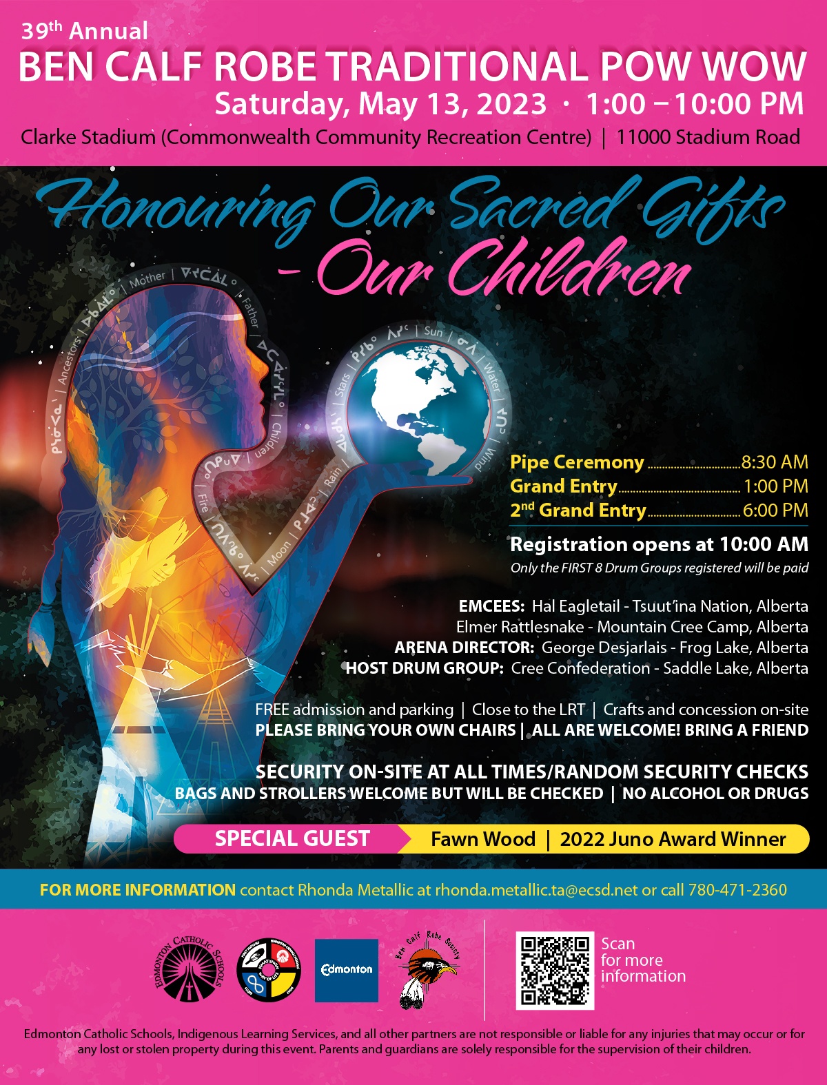 Edmonton Catholic Schools and Indigenous Learning Services, in partnership with the City of Edmonton, invite all Edmonton and surrounding community members to join us for our 39th Annual Ben Calf Robe Traditional Powwow.